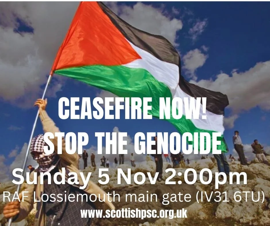 SPSC Aberdeen supported an excellent demo today called by SPSC Moray outside Lossiemouth air base demanding that the UK end its complicity in Israel’s war crimes by supporting their military action against Palestinians. It came as almost 10000 Gazans had been killed in Israel’s revenge massacre, with one child murdered every 10 minutes, as the world looks on. Speaker after speaker demanded action to stop Israel’s war crimes and for a #CeaseFireNow